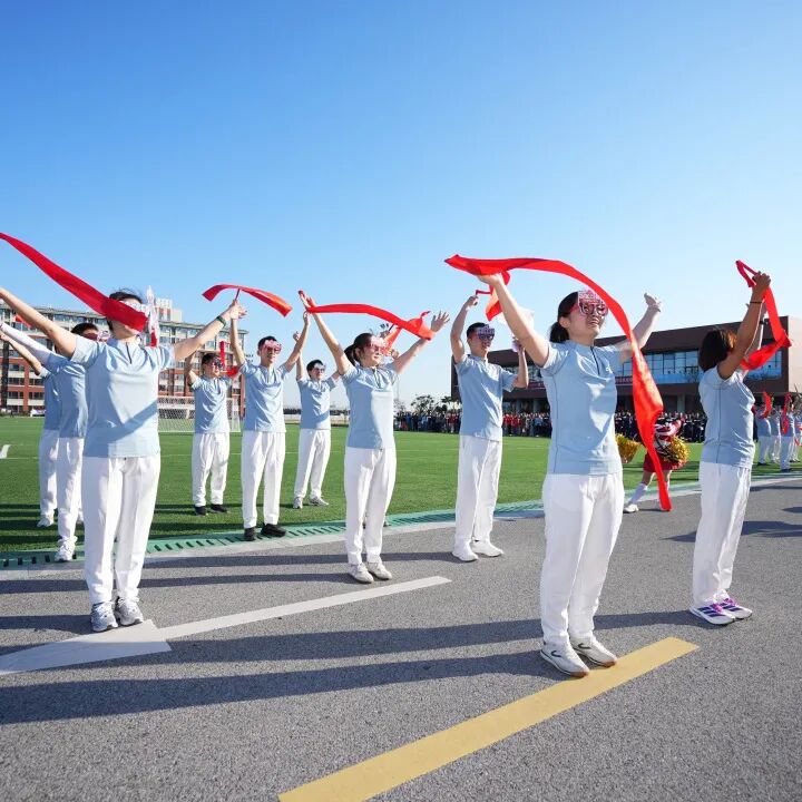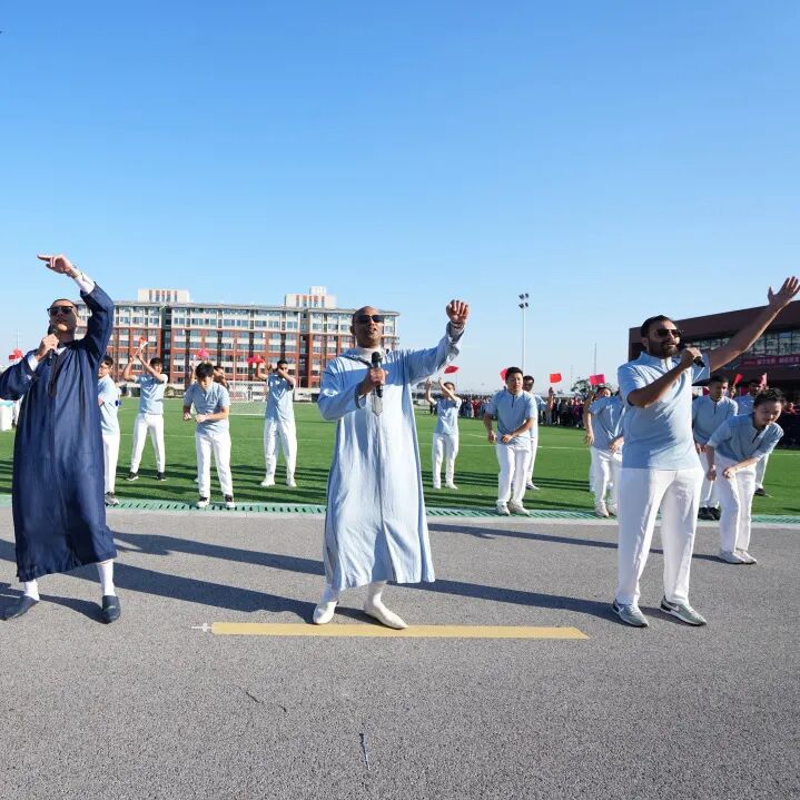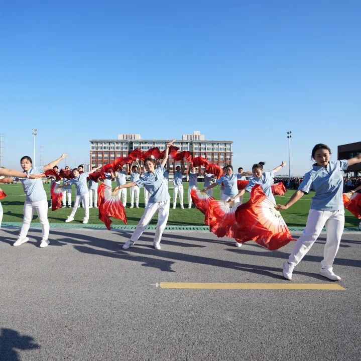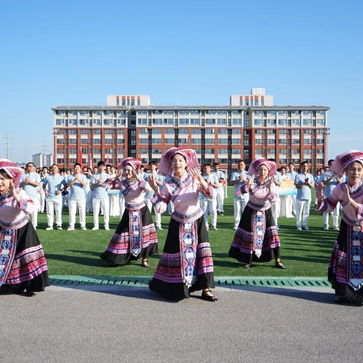 晨曦初照,开幕式现场人声鼎沸,热闹非凡,8支参赛队伍迈着整齐的步伐,跟随国旗、司旗、运动会会旗入场,带来各具特色的精彩表演。彩带飘扬、花团簇簇,啦啦操与大合唱、彩扇舞与锦缎阵,形式各样的开幕式表演将民族的、也将世界的文化凝结汇聚,展现出全球中伟人拼搏向上、自立自强的精神面貌,诠释了“责任 创新 多元 共赢”的精神内核。
