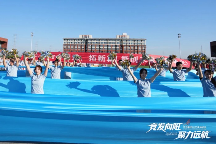 开幕式上,当中伟金能方队迈着矫健步伐入场时,澎湃的“蓝色浪潮”席卷全场。他们带来的《乘风破浪》主题表演,以翻涌的蓝绸为海,以矫健的身姿为舟,将运动的活力与产业的蓝图巧妙融合,生动演绎中伟金能在功能材料的广阔蓝海中,以坚定不移的信心、锐意进取的魄力、攻坚克难的智慧,破浪前行。这不仅是表演,更是一次面向全集团的铿锵宣言。